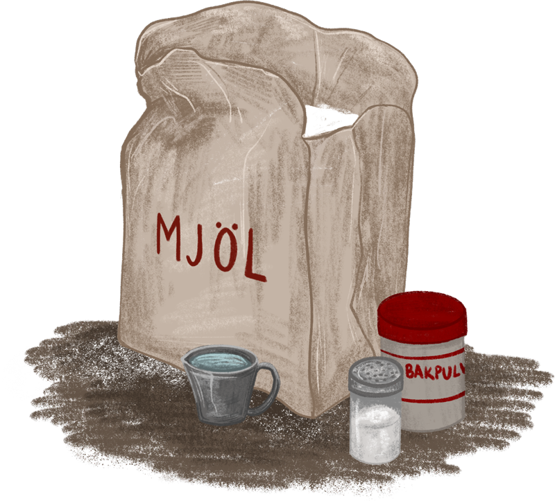 Hemma blandar du: mjöl, bakpulver och salt.